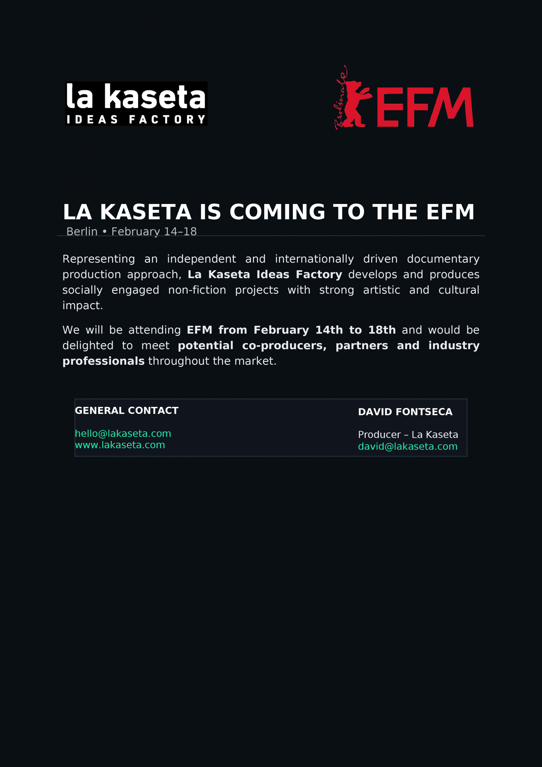 We will be attending EFM from February 14th to 18th and would be delighted to meet potential co-producers, partners and industry professionals throughout the market.